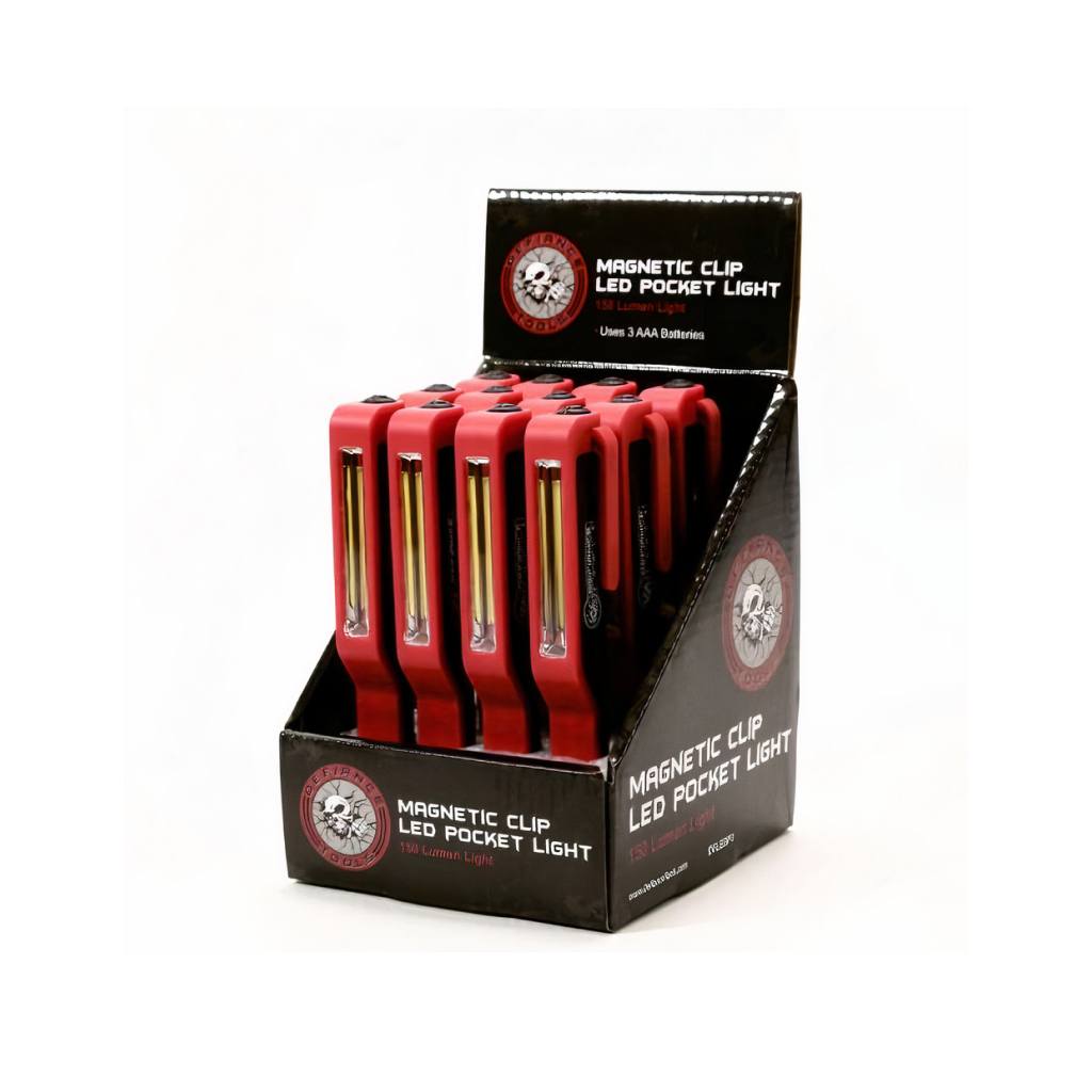 LED Pocket Light with a magnetic clip by Defiance Tools has a single 150 lumen COB LED with a handy rotating pocket clip to give you hands-free light.